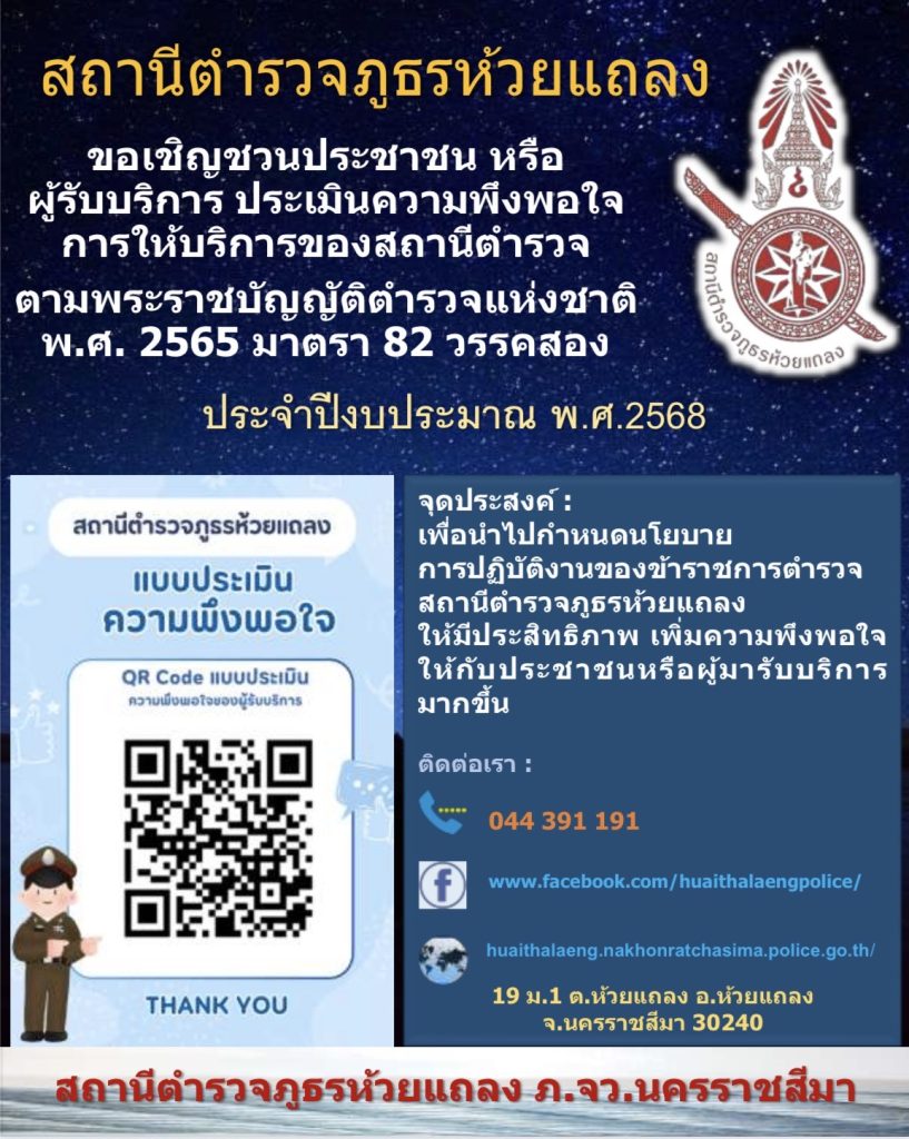ขอเชิญร่วมประเมินความพึงพอใจของผู้รับบริการ สภ.ห้วยแถลง 1 มกราคม 2567 โดย admin / ข่าวประชาสัมพันธ์,ข่าวฝากประชาสัมพันธ์ จำนวนผู้เยี่ยมชม: 3 FacebookFacebookXXLINELine